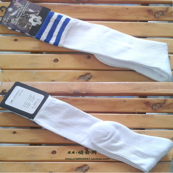 包邮白色蓝条足球袜男长筒袜子全棉毛巾底过膝防滑运动足球袜长袜