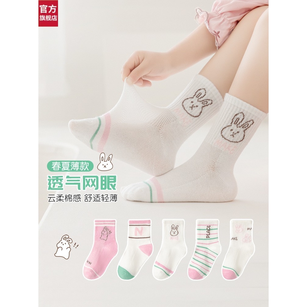 全棉纯时代特价5双包邮 儿童袜子夏季网眼男女童运动中筒袜卡通兔