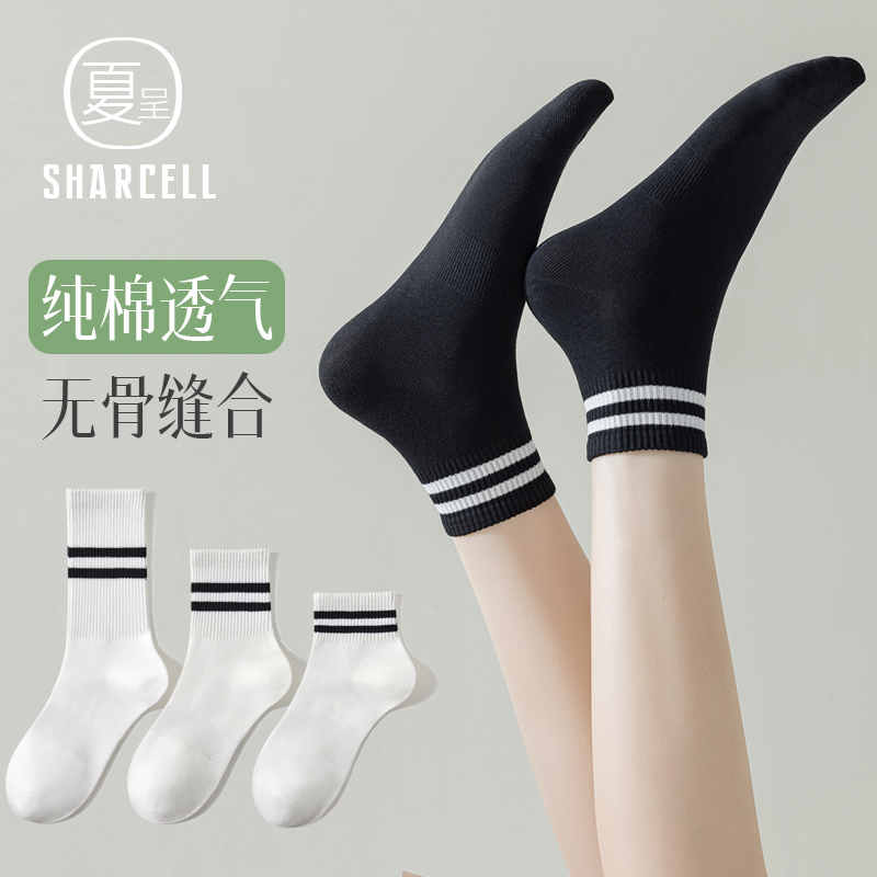 黑色袜子女纯棉夏季薄款中筒袜防臭跑步健身运动条纹学生无骨短筒