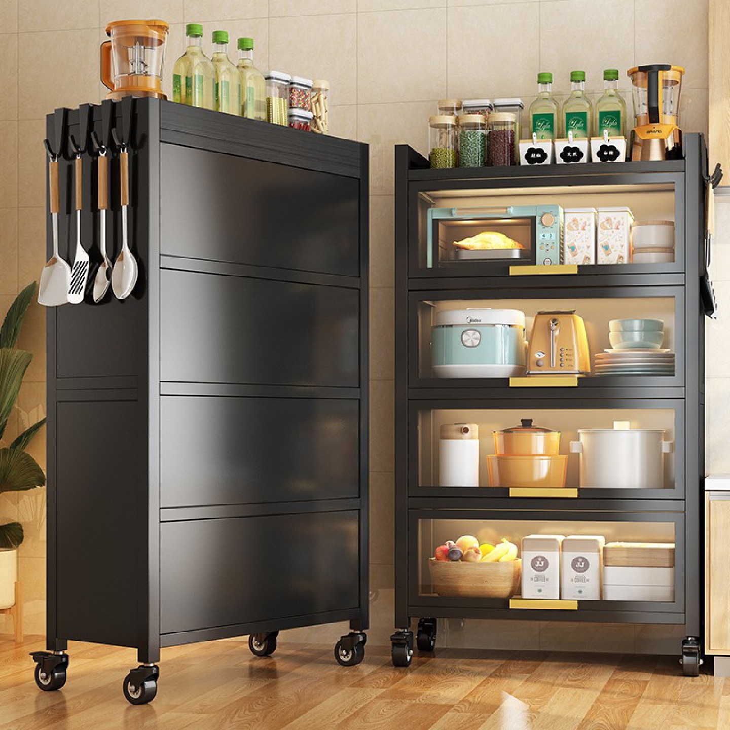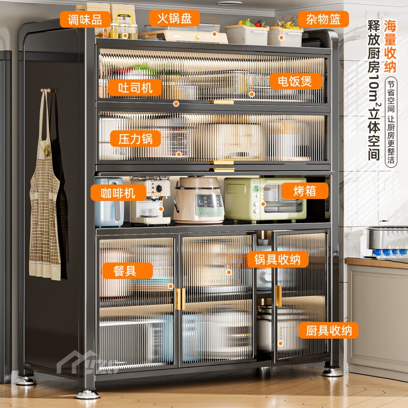 厂家厨房置物架落地多层带门防尘收纳柜放锅具电器零食餐边储物柜