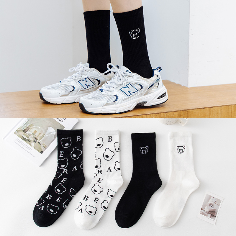 袜子女中筒秋冬棉袜女士黑白刺绣潮流长筒保暖运动袜诸暨秋季