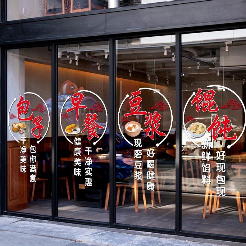 创意早餐店玻璃门贴纸包子豆浆馄饨小吃店铺橱窗背景装饰广告贴画